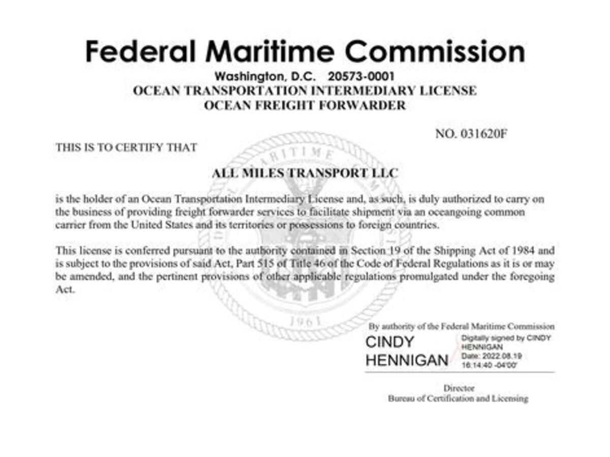 We received the long-waiting Ocean Transportation Intermediary (OTI) license from the Federal Maritime Commission (FMC). As an FMC-approved freight forwarder, we are qualified to arrange international marine transportation.